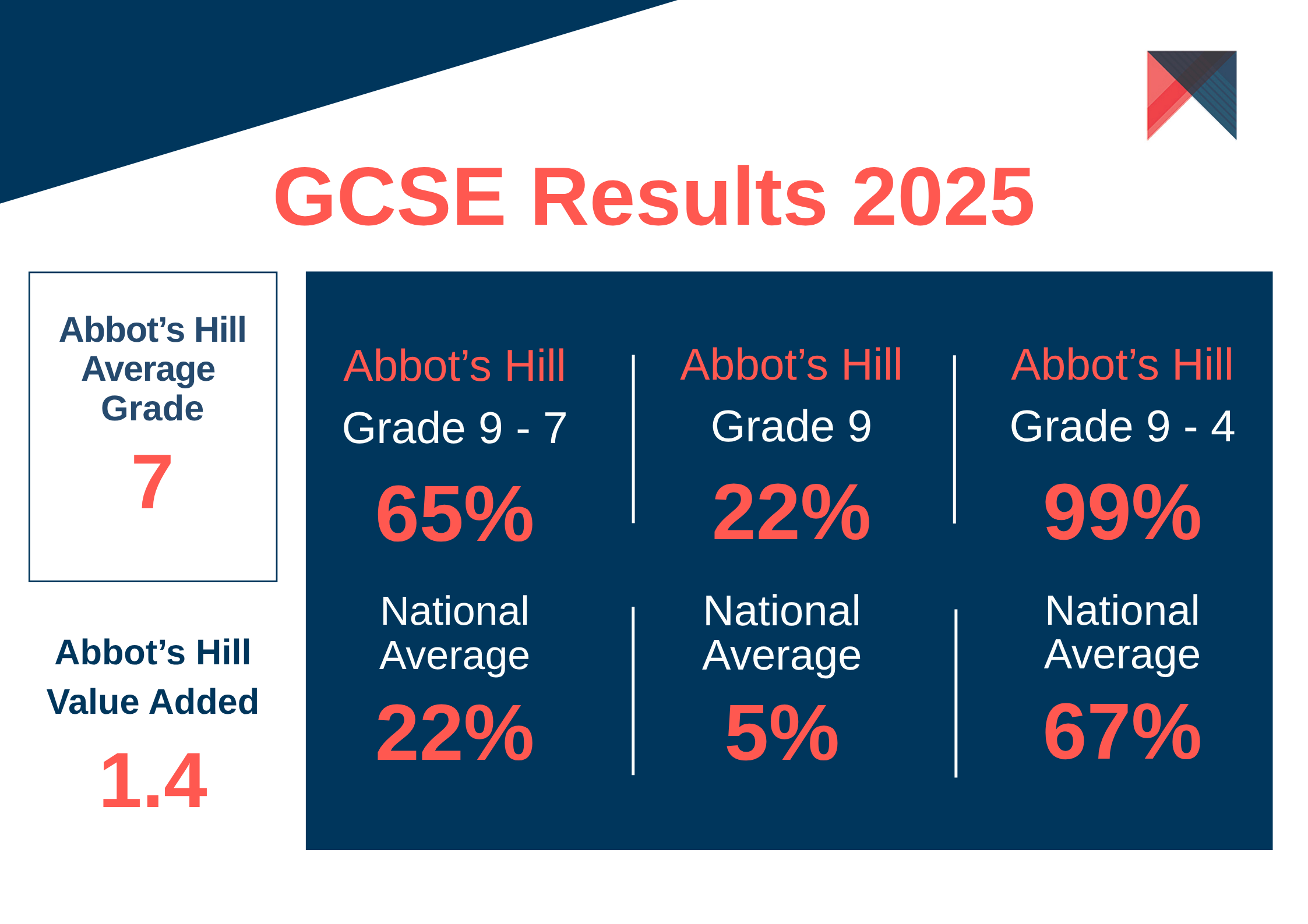 Furthermore, pupils are clearly stretched as we significantly outperform the national average for the top grades (7-9). This underpins our knowledge that at Abbot’s Hill, potential is nurtured and excellence is cultivated.